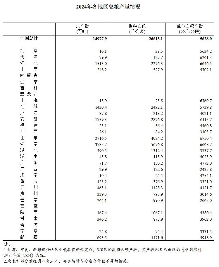 根据对全国25个夏粮生产省(区、市)的调查,2024年全国夏粮播种面积、单位面积产量、总产量如下:一、全国夏粮播种面积26613千公顷(39920万亩),比2023年增加4.5千公顷(6.8万亩),保持稳定。其中小麦播种面积23091千公顷(34636万亩),比2023年增加31.7千公顷(47.5万亩),增长0.1%。二、全国夏粮单位面积产量5628.0公斤/公顷(375.2公斤/亩),比2023年增加135.4公斤/公顷(9.0公斤/亩),增长2.5%。其中小麦单位面积产量5985.8公斤/公顷(399.1公斤/亩),比2023年增加150.4公斤/公顷(10.0公斤/亩),增长2.6%。三、全国夏粮总产量14978万吨(2996亿斤),比2023年增加362.7万吨(72.5亿斤),增长2.5%。其中小麦产量13822万吨(2764亿斤),比2023年增加365.8万吨(73.2亿斤),增长2.7%。2024年7月12日