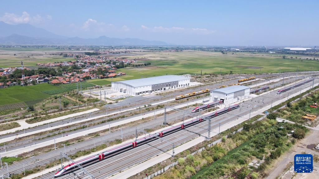 ▲ 9月13日,在印度尼西亚万隆,雅万高铁动车组列车停靠在德卡鲁尔动车所附近(无人机照片)。新华社记者 徐钦 摄