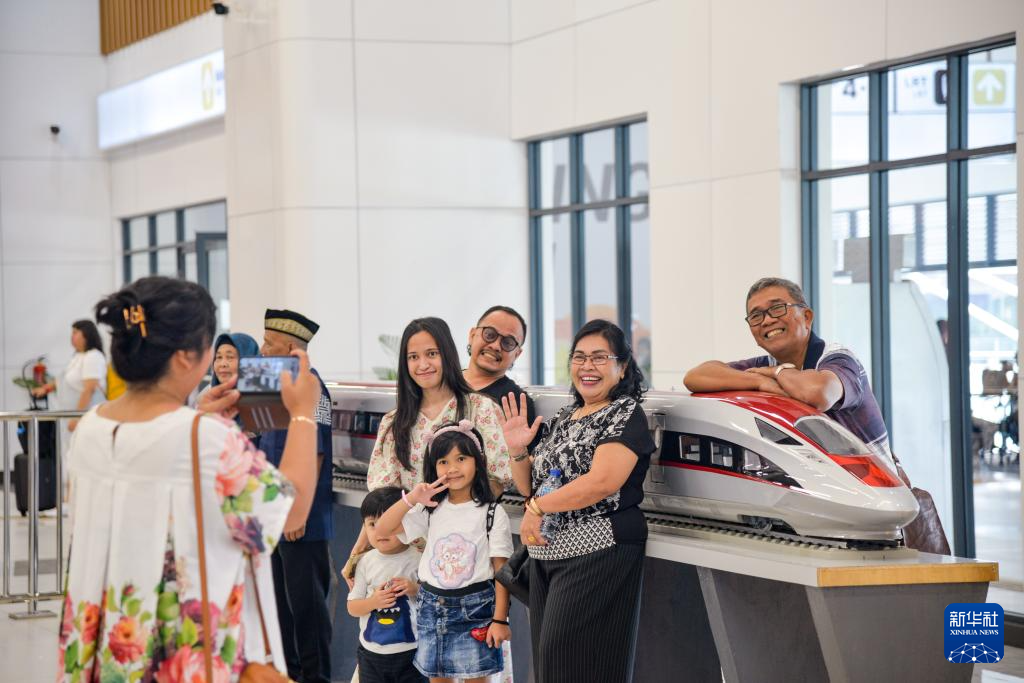 ▲ 6月17日,在印度尼西亚雅加达哈利姆站候车大厅,人们和雅万高铁高速动车组模型合影。新华社记者 徐钦 摄