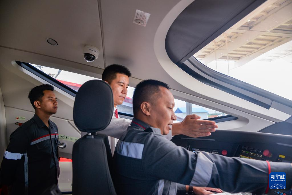 ▲ 9月12日,在印度尼西亚万隆,中国高铁司机张跃(中)对印尼高铁司机阿古斯·德维奥诺·维多多(右)进行手把手教学指导。新华社记者 徐钦 摄