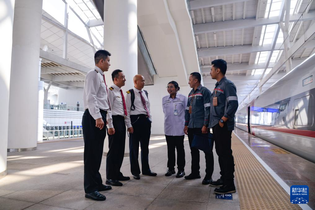 ▲ 9月12日,在印度尼西亚万隆德卡鲁尔站站台,雅万高铁中国和印尼高铁司机对高铁驾驶操纵学习情况进行总结分析。新华社记者 徐钦 摄